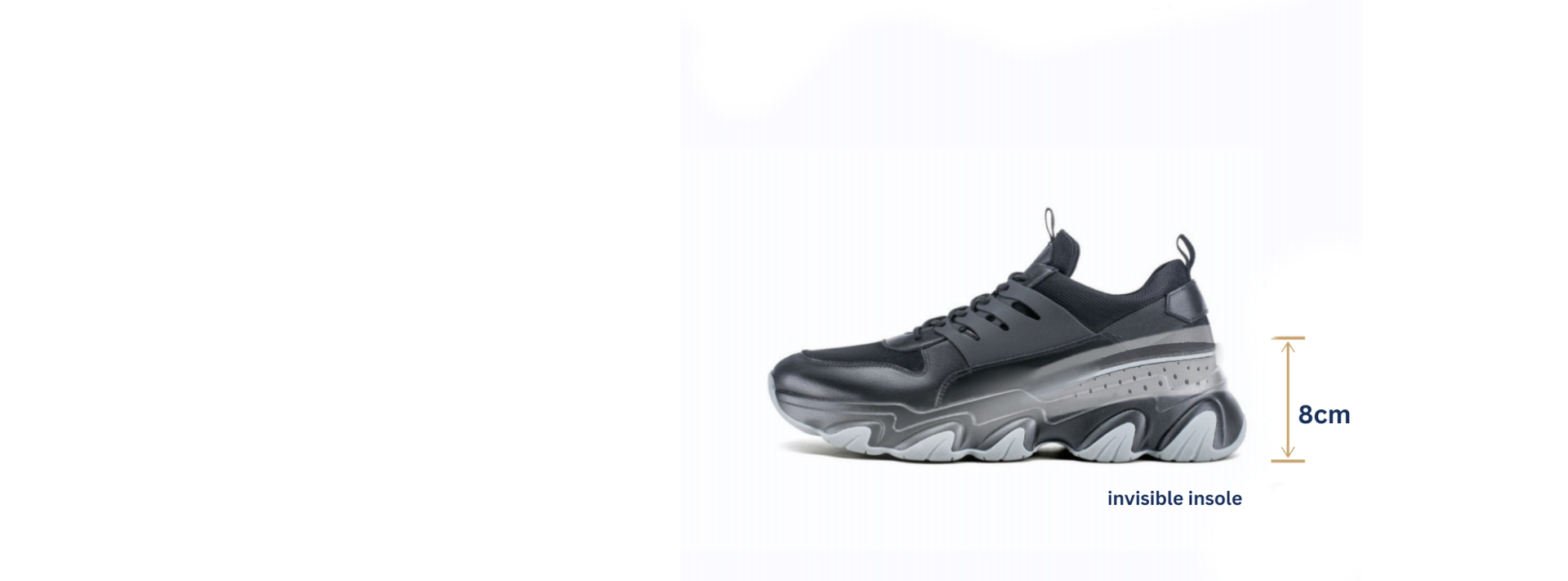 Unlike traditional elevator footwear, our shoes feature an innovative invisible inner-sole construction that adds up to 8 cm of height without sacrificing comfort or design.