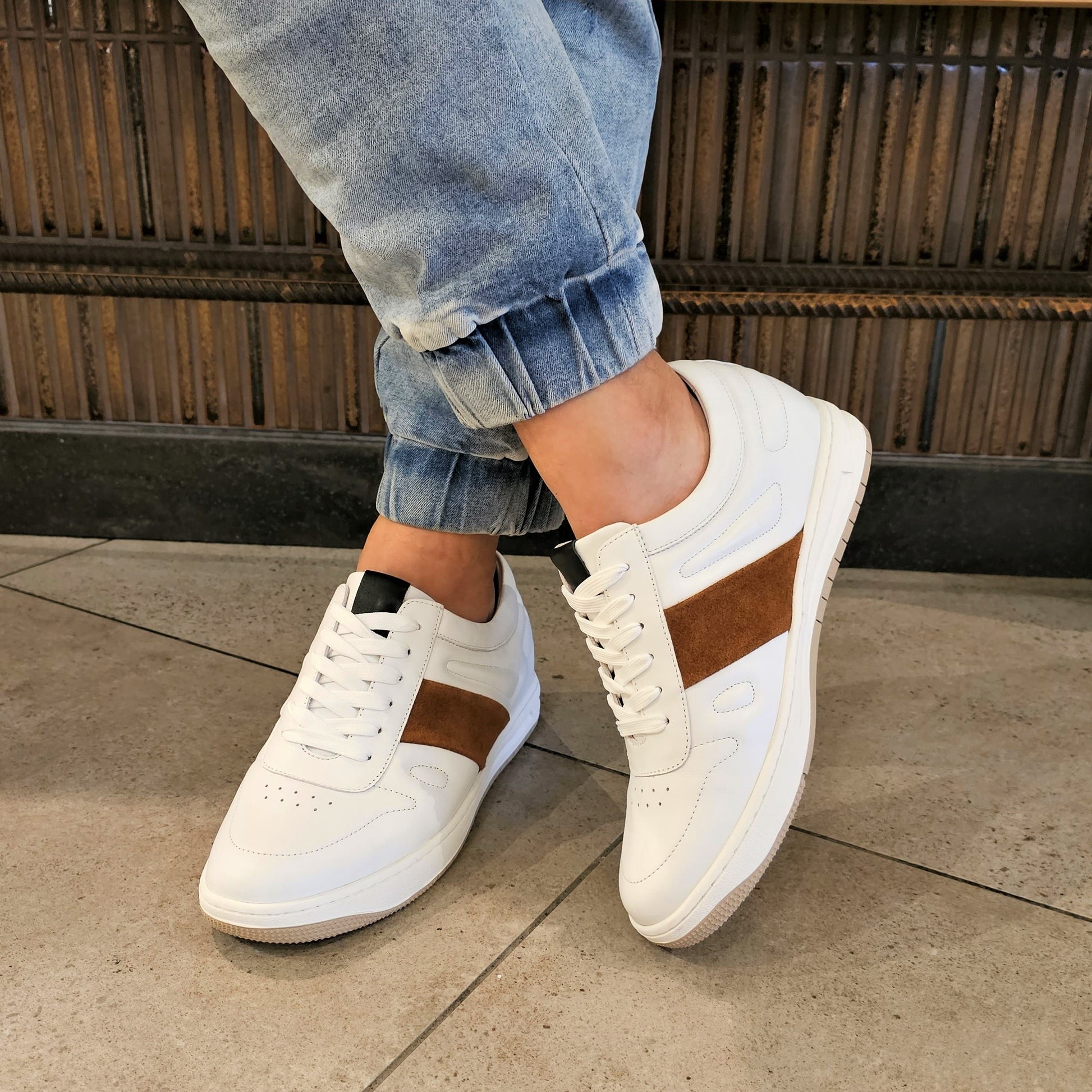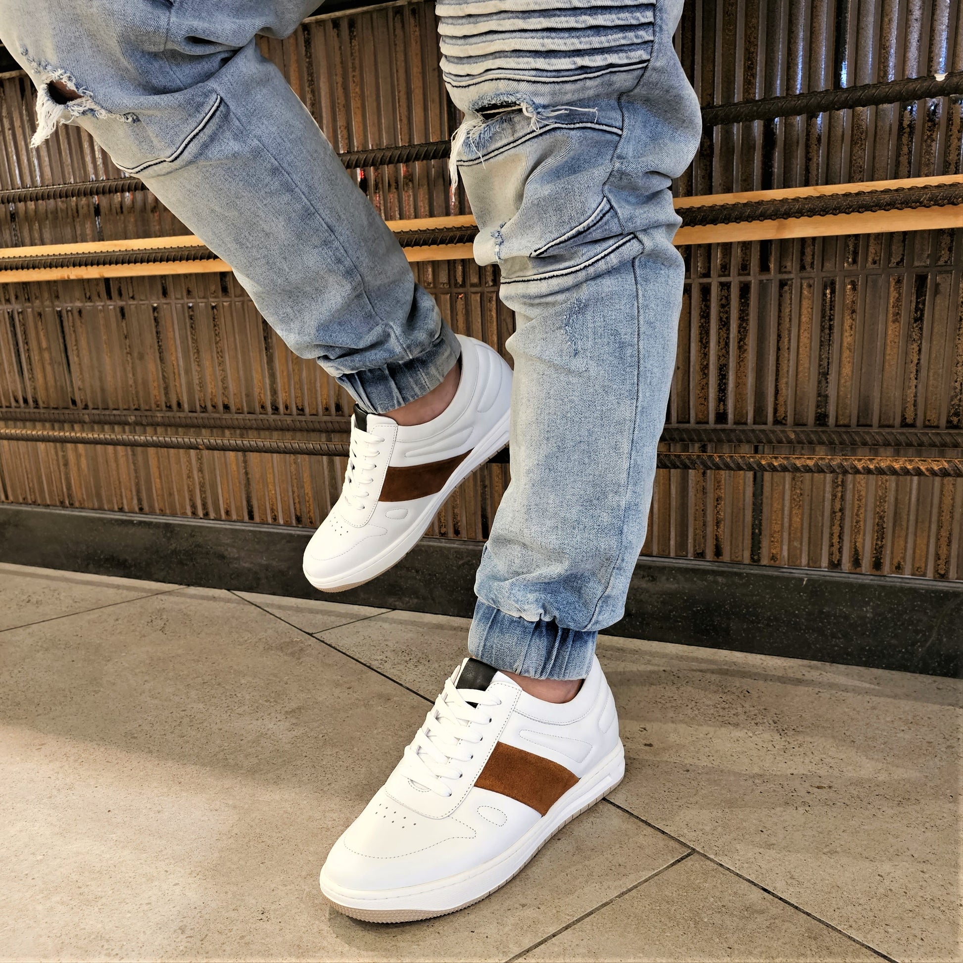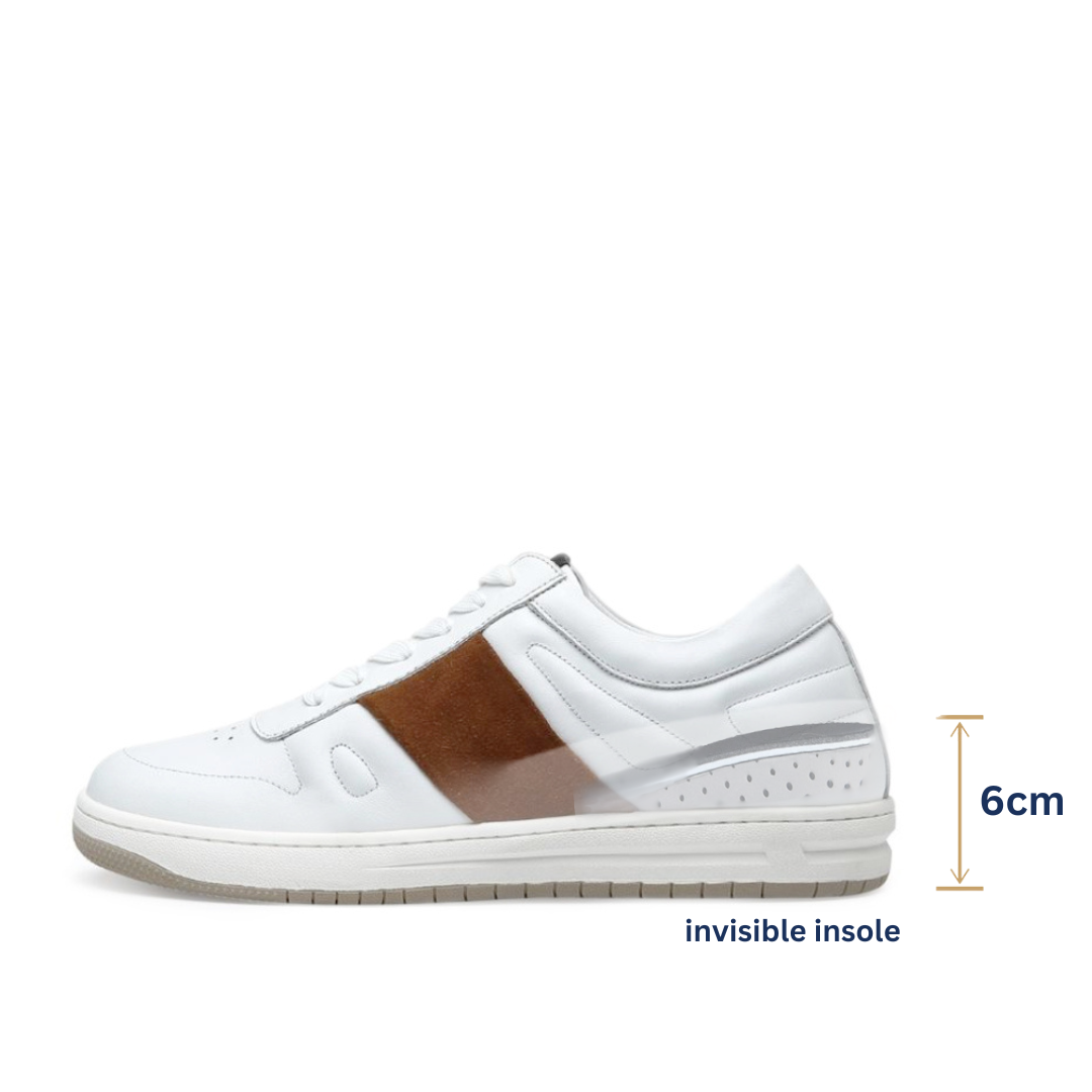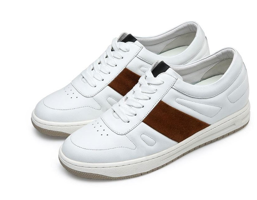 ● Step into elegance and upgrade your wardrobe with Lucca white casual shoes. Crafted from premium leather with luxurious brown suede detailing, it offers a classic look that never goes out of style. Comfort and convenience are guaranteed by the comfortable layer and invisible height increasing insole that adds 6cm to your stature. The anti-slip rubber sole gives it a versatile yet authentic look, perfect for any occasion. Elevate your style today with Sir Lucca!